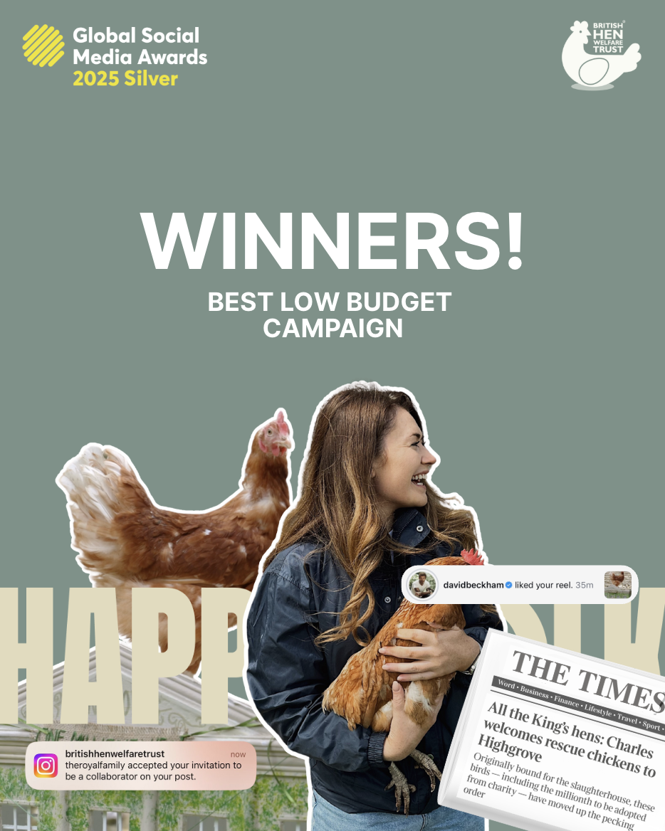 We’re incredibly proud to announce that we WON at the Global Social Media Awards achieving a Silver for Best Low Budget Campaign for our One Millionth Hen campaign with British Hen Welfare Trust!